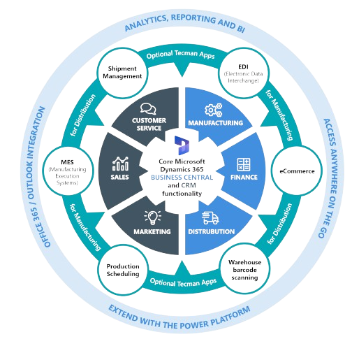 Microsoft Dynamics NAV or Microsoft Dynamics 365 Business Central tracks and analyzes your business information. With end-to-end integration, your company can efficiently manage: